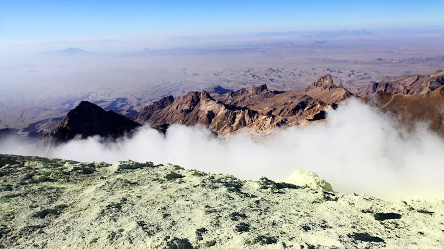 El colosal volcán de casi 4.000 metros de altura se eleva sobre un grupo de montañas cercanas más pequeñas formadas por la corteza del océano Arábigo. Es el mayor volcán del sureste de Irán.