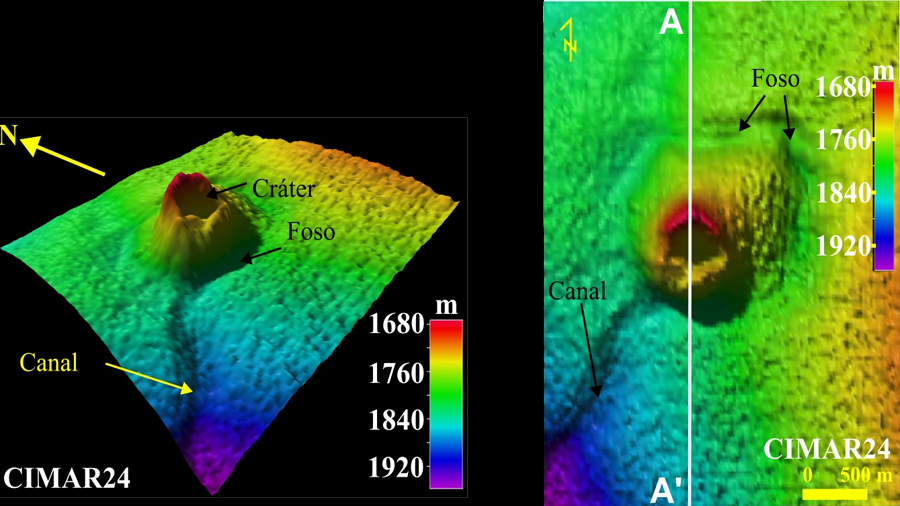 Bautizado como “Volcán de lodo de Cucao”, la estructura se encontraría a unos 86 kilómetros al oeste del archipiélago de Chiloé. Según detallan en el paper publicado en la revista científica Marine and Petroleum Geology, dependiente de Elsevier, tendría 1,5 kilómetros de diámetro y un cráter de 450 metros de ancho y 80 de profundidad.