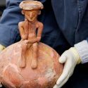 Arqueólogos israelíes han desenterrado una jarra de 3 mil 800 años con una estatuilla de una persona que parece profundamente pensativa, sentada con las rodillas dobladas y la cabeza apoyada en la mano.