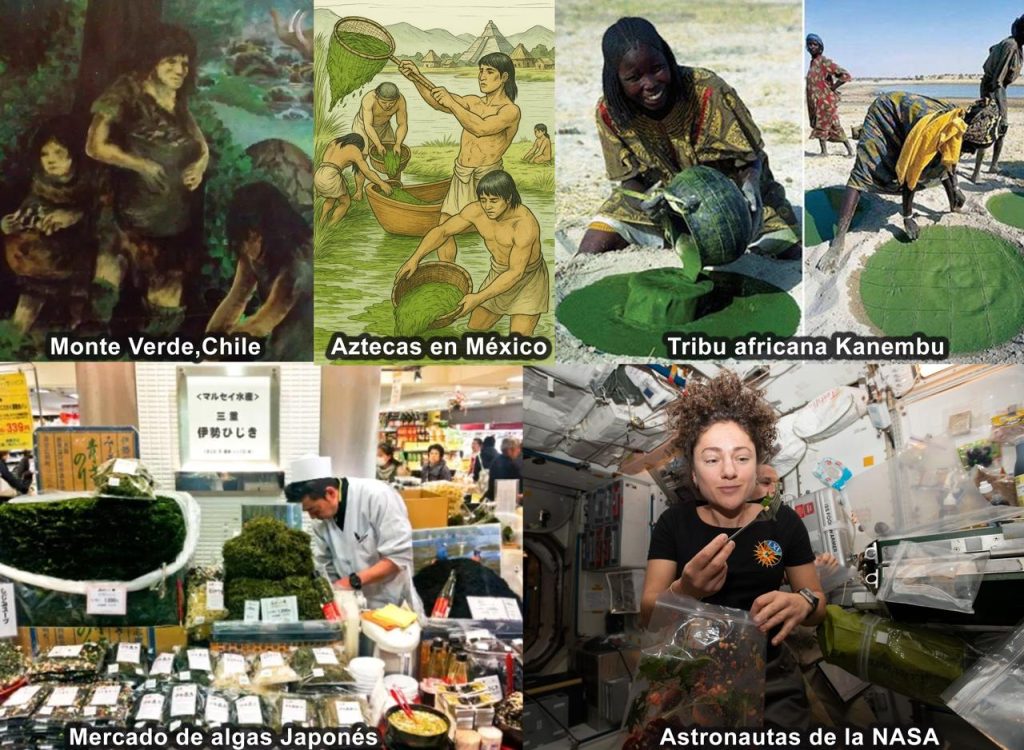 Desde épocas muy antiguas, las culturas mesoamericanas y africanas han encontrado en las microalgas la utilidad y el tesoro que albergan en su bioquímica (Figura 1).El uso humano más antiguo registrado de algas y microalgas data entre los años 14,220 y 13,980 a.C. En el asentamiento de Monte Verde, al sur de Chile, se encontró evidencia arqueológica de al menos 10 diferentes géneros de algas provenientes de distintas condiciones climáticas (1). Según los vestigios encontrados, estas eran utilizadas tanto en su alimentación cotidiana como con fines medicinales. Entre ellas se encuentran la luga negra (Sarcothalia crispata), luche (Porphyra columbina) y cochayuyo (Durvillaea antarctica) las cuales hoy en día siguen siendo consumidas de manera popular en la zona por su gran valor nutricional.
