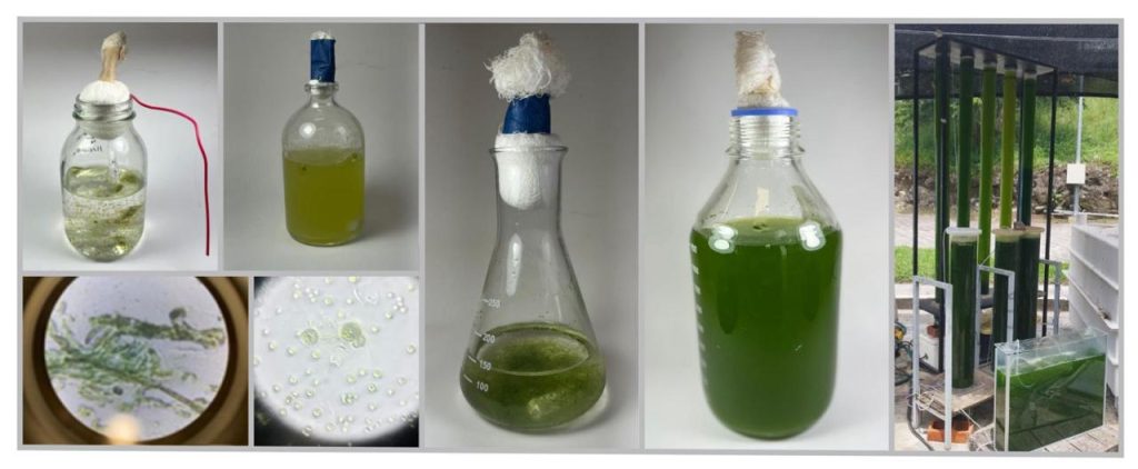 Así, en nuestros laboratorios probamos diferentes especies de microalgas y modificamos ciertas condiciones de crecimiento, bajo la luz del sol o con lámparas controladas, dentro de tubos transparentes o biorreactores, con medios de cultivo preparados o aguas residuales. En diversas condiciones evaluamos cómo crecen las microalgas, qué compuestos producen y cuales son capaces de degradar, cuánto oxígeno libera o cuánta biomasa producen. La biomasa es el material orgánico que forman al crecer, principalmente formado por proteínas, azúcares y aceites que tienen diferentes aplicaciones biotecnológicas como biofertilizantes, biodiesel o suplemento alimenticio, dependiendo del microorganismo y el sustrato utilizado.