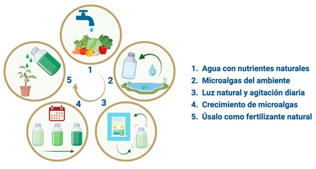 En pocos días, el líquido comenzará a tornarse verde: ese color es señal de que las microalgas están activas y realizando fotosíntesis. Con este pequeño cultivo, estarás participando en un ciclo natural: las microalgas absorben el CO₂ del aire y liberan oxígeno, ayudando a mejorar la calidad del ambiente inmediato. Cuando el cultivo se vuelva más denso, puedes diluir una parte para continuar tu cultivo de microalgas y la otra puedes utilizarla para para regar tus plantas, ya que las microalgas liberan compuestos que enriquecen el suelo y aportan nutrientes naturales sin necesidad de fertilizantes químicos. De esta manera, lo que comenzó como un pequeño experimento en casa puede convertirse en una fuente constante de fertilizante orgánico, reduciendo el uso de productos químicos y cerrando pequeños ciclos de aprovechamiento.