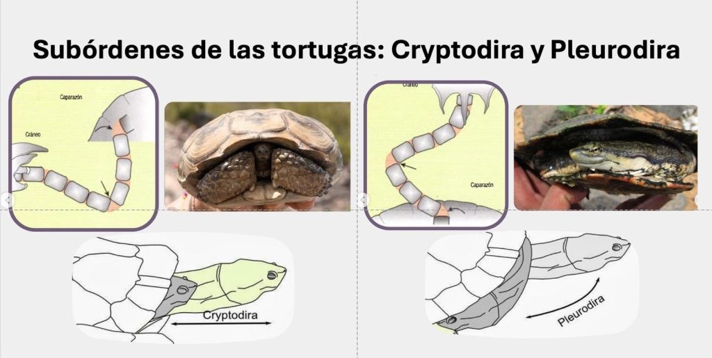 Créanlo o no, cerca de las 275 especies de tortugas que existen hoy en día se clasifican en dos grandes grupos: las que esconden su cabeza en el caparazón retrayendo su cuello en forma de “U” (suborden Cryptodira) y aquellas que meten la cabeza de lado (suborden Pleurodira) (Figura 2). El primer grupo incluye a las tortugas marinas, a las mordedoras, a las de concha blanda, a las terrestres y un sin fin de tortugas que habitan ríos, lagunas y pantanos. En contraste, el segundo grupo sólo incluye a algunas especies dulceacuícolas que se encuentran en Sudamérica, África y Australia.