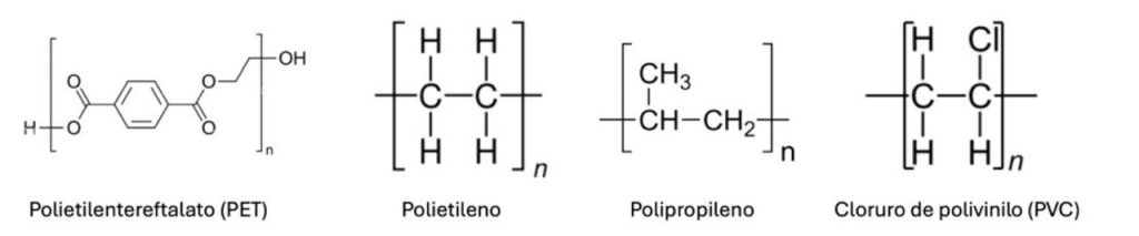 Los plásticos son polímeros sintéticos, es decir, no son moléculas naturales, sino que los hemos fabricado los humanos para que cumplan diferentes funciones. Los plásticos son macromoléculas, es decir, están formados por muchísimas moléculas pequeñas (monómeros) unidos entre sí mediante enlaces químicos para formar cadenas largas, o polímeros. Podemos imaginar a un polímero como un collar larguísimo, compuesto por miles de cuentas, y las cuentas que conforman ese collar, son los monómeros. Debido a que los enlaces químicos que unen a los monómeros pueden ser muy fuertes, los plásticos no se degradan fácilmente, por lo que una vez que son liberados al medio ambiente, se convierten en contaminantes persistentes. Los polímeros sintéticos más utilizados son el tereftalato de polietileno (PET), los polietilenos de alta (HDPE) y baja densidad (LDPE), el cloruro de polivinilo (PVC), el polipropileno (PP) y el poliestireno (PS), entre otros. En la Figura 1 se muestran los monómeros que componen a algunos de estos plásticos. Esto significa que cuando decimos plásticos, no podemos ponerlos a todos en la misma canasta, por así decirlo, porque en realidad estamos hablando de macromoléculas muy diferentes entre sí a nivel químico (1).