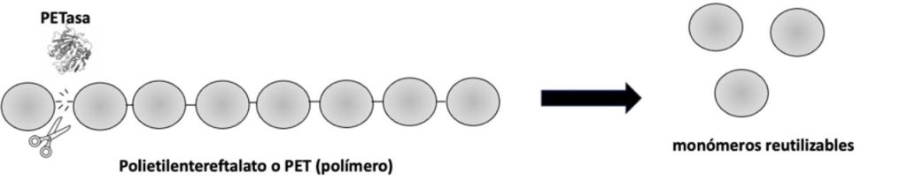 Afortunadamente las enzimas como solución a éste y otros problemas de contaminación son ya una realidad. El caso más avanzado, como mencionamos, es el de las PETasas. Existen compañías que tienen planes de realizar la depolimerización enzimática de PET a gran escala. Por ejemplo, la empresa Carbios ha anunciado el despliegue de una unidad industrial en Francia con este propósito y que debería comenzar su operación el próximo año (7, 8). Estos bioprocesos son muy importantes pues el PET puede despolimerizarse enzimáticamente y descomponerse en sus monómeros, los cuales a su vez pueden utilizarse para sintetizar otros materiales o compuestos químicos útiles para los humanos (Figura 4). Es decir, el uso de estas enzimas permite la práctica de una economía circular en torno al PET.