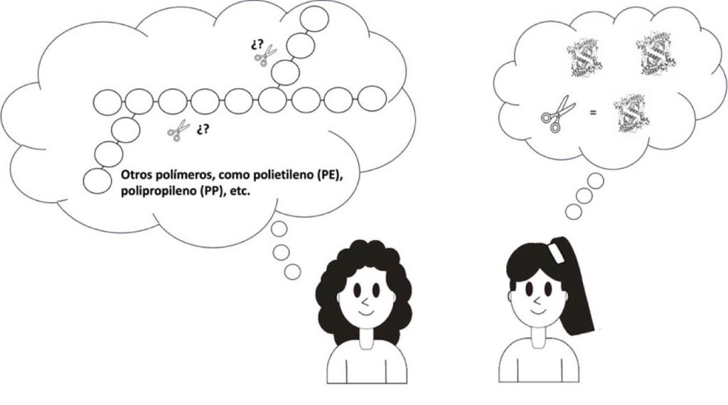 Mientras eso sucede, tenemos que seguir lidiando con el problema de la contaminación por los plásticos sintéticos actuales. Las PETasas son un extraordinario ejemplo y promesa de que con enzimas se puede aliviar el problema de contaminación con plásticos. Pero aún falta camino por recorrer. ¿Qué hacer con los otros plásticos, los que no son PET, para los cuales aún no hay alternativas de degradación enzimática? Hay que seguir investigando, porque algo que sabemos muy bien es que las enzimas tienen una cierta especificidad, es decir, no pueden romper todos los enlaces químicos. Las PETasas no pueden despolimerizar a plásticos con enlaces químicos diferentes a los del PET, que son de tipo éster. Los enlaces químicos presentes en el polietileno (PE) y el polipropileno (PP) son de otro tipo, son enlaces C-C (ver la Figura 1), por lo que las PETasas no pueden romperlos. Por cierto, el PE y PP no solo tiene enlaces C-C que son químicamente más resistentes que el enlace éster, lo que los hace más difíciles de romper, sino que además son polímeros ramificados, lo cual significa que son más complejos que los polímeros lineales como el PET. Quiere decir que necesitamos enzimas, diferentes a las PETasas, si queremos despolimerizar al PE y al PP (Figura 5). A la fecha, no se ha encontrado ninguna enzima capaz de hacer esto.