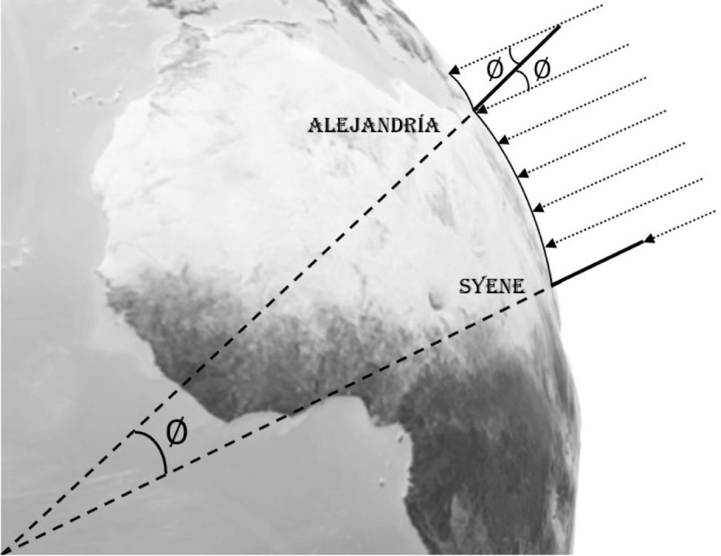 Su razonamiento se basa en principios de la Geometría. Suponía que las ciudades de Alejandría y Syene (hoy Asuán) estaban ubicadas en el mismo meridiano. Esto no es completamente correcto. La ciudad de Syene se encuentra aproximadamente a 3° de la ciudad de Alejandría. Midió la distancia entre ambas ciudades alrededor de 5,000 [DR1] estadios (en unidades actuales, 925 km) y colocó en cada ciudad un gnomon, un objeto vertical con una longitud de varios metros, cuya sombra se usaba como reloj solar. Al medio día del solsticio de verano observó que el gnomon ubicado en Syene no proyectaba ninguna sombra sobre el piso, lo cual significaba que el Sol se encontraba exactamente en el cenit. Sin embargo, en el mismo momento el gnomon de Alejandría sí proyectaba una sombra que podía medirse. Así pudo asignar un ángulo a la longitud de arco de 5,000 estadios, y extrapolando a un círculo completo (360°) pudo estimar la circunferencia de la Tierra (Figura 1).