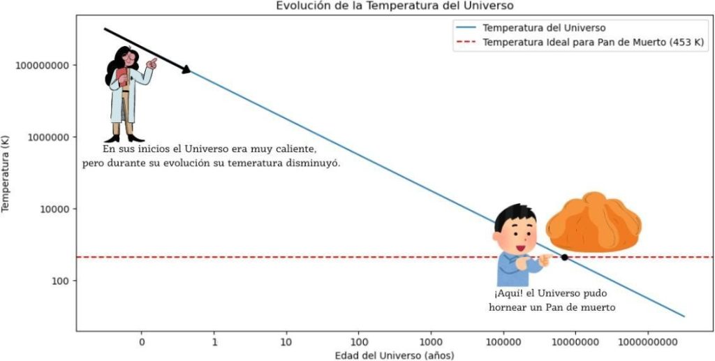 Como dato curioso para nuestros lectores, cuando el universo tenía unos 8 millones de años, tuvo la temperatura perfecta como para hornear un delicioso pan de muerto (Fig. 2). Es decir, que nuestro universo llegó a tener una temperatura de 180 grados Celsius (equivalente a 453.15 grados Kelvin). Actualmente la temperatura de nuestro universo es de unos 2.73 Kelvin (equivalente a -270.42 grados Celsius) [6], lo que hace que nuestro universo sea bastante frío.