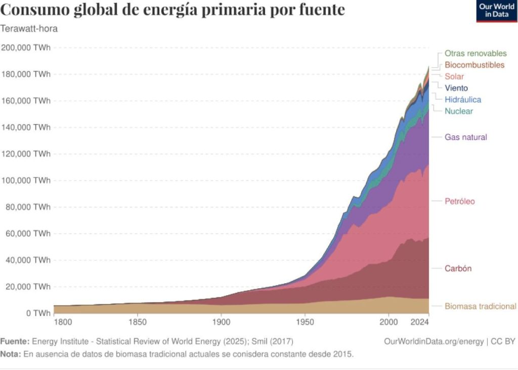 - Ahora que lo mencionas – me dijo-, hace unos días me dio curiosidad y revisé los datos de consumo de energía en el mundo. Al parecer, el consumo energético mundial se encuentra en un máximo histórico. Mira esta gráfica (figura 1). El consumo de energía que proviene principalmente de combustibles fósiles supera por mucho a las fuentes renovables, se encuentra en un máximo histórico y la tendencia es de aumentar.