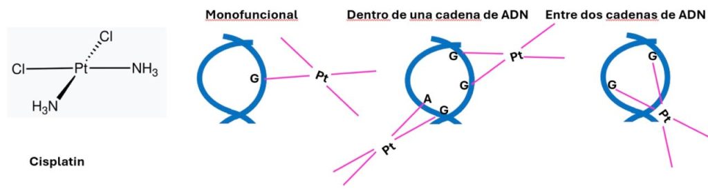 Los compuestos citostáticos tienen la capacidad de atacar la división celular de los tumores debido a que se unen fuertemente al ADN, formando una unión covalente (Figura 1). Al unirse así inhiben la síntesis del ADN, impidiendo que las células se dividan de manera normal (6). En caso del cisplatino, esta inhibición se da por la unión del cisplatino con las bases nitrogenadas del ADN, específicamente con las purinas (guanina o adenina). El cisplatino puede formar unión con una sola base nitrogenada (unión mono funcional), o con dos bases dentro de la misma cadena, o entre diferentes cadenas de ADN (Figura 1), impidiendo en todos los casos la duplicación del ADN. La duplicación es esencial para formar nuevo material genético, que será segregado a las dos células hijas durante la división celular. Por eso el cisplatino es un medicamento potente que se usa en quimioterapia, a pesar de su efecto citotóxico.