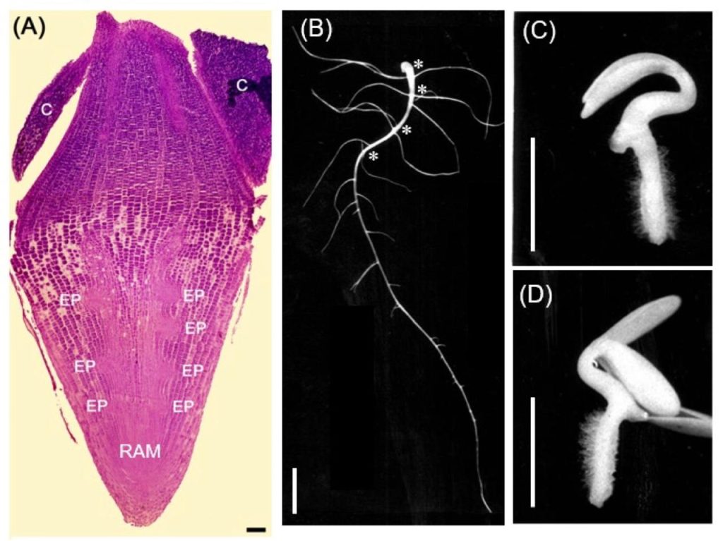 Todas las plantas tienen un sistema de raíces, que son importantes para cumplir con funciones de captación y transporte de agua y compuestos minerales a la parte aérea (tallo, hojas, flores). Cualquier raíz puede formar nuevas raíces, llamadas raíces laterales. Entonces, la idea fue encontrar una especie vegetal que tenga semillas con capacidad de germinación rápida y que desarrollaran raíces laterales muy pronto después de la germinación. Una búsqueda nos llevó a encontrar que las plantas de la familia de calabazas (Cucurbitáceas) tienen estas características. Encontramos que, en esta familia de plantas, las semillas de pepino germinan muy fácil y tan solo en dos a tres días después de germinación forman ya raíces laterales, que emergen a partir de la raíz primaria (Figura 2A). Además, mi estudio demostró que la razón por la que el pepino forma raíces laterales tan rápidamente es debido a que tienen primordios de las raíces laterales ya formados desde el embrión, que no tienen todas las plantas (7).