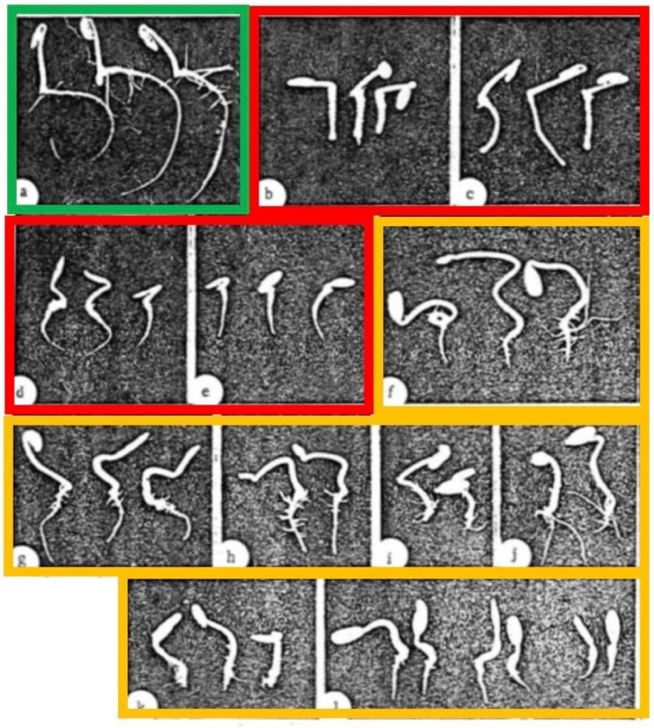 Estos hallazgos nos llevaron a proponer un ensayo más rápido, fácil y simple para la búsqueda de un efecto citostático en compuestos cuyo efecto no era conocido aún (9). Encontramos que cuando las semillas de pepino germinan en una solución conteniendo citostáticos, como Cisplatino, Mitomicina, 8-Azaguanina (análogo de guanina), y cloranfenicol (inhibidor de síntesis de proteínas), las raíces laterales no se desarrollan, y solo la radícula embrionaria que desarrolla la raíz primaria está presente (Figura 3, fotos rodeadas por una línea roja). Cuando las plántulas de pepino crecen en presencia de compuestos extremadamente tóxicos, como las sales de Talio (Tl) o mercurio (Hg), la raíz crece pobremente, pero aun así no se inhibe la emergencia de las raíces laterales (Figura 3, fotos rodeadas por una línea naranja).