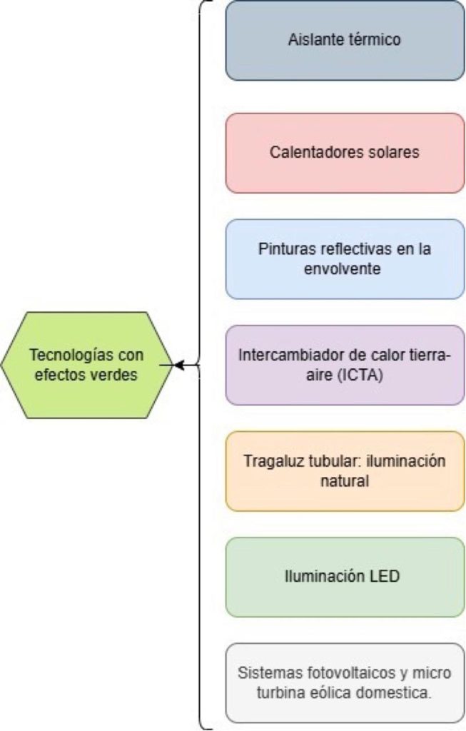 Las tecnologías con efecto verde son las que nos ayudan a disminuir la huella de carbono, en este articulo nos enfocamos en las que contribuyen en el sector de la construcción habitacional. Algunas de estas tecnologías con efectos verdes son: los intercambiadores de calor tierra-aire y los techos aislados con paneles fotovoltaicos y solares para generar energía eléctrica y reducir las emisiones de gases de efecto invernadero. A continuación, se hablará más a detalle de estas (Figura 1).