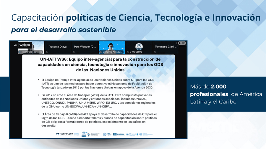 Esta iniciativa, coordinada por CEPAL, y ejecutada conjuntamente con UNCTAD, UNESCO, UNIDO, y UNU-MERIT, en el marco del Equipo de Trabajo Interagencial en CTI para los ODS (UN Interagency Task Team on STI for the SDGs – IATT), registró más de 2.000 participantes provenientes de 33 países. La altísima convocatoria superó todas las expectativas, reflejando el creciente interés regional por fortalecer las capacidades de CTI como motor del desarrollo sostenible.